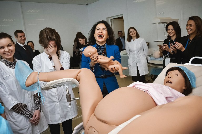 Затем Тина Канделаки посетила Центр симуляционного обучения РязГМУ, откуда сделала несколько instаgram stories. В кадр попали роды робота Fidelis Lucina. Канделаки не только засняла весь процесс, но и подержала в руках «родившегося» младенца. Окружающие ее медики сообщили, что родилась девочка, и поздравили ее. Телеведущая засмеялась от смущения и отдала «малыша». Также ей показали виртуальный симулятор ультразвуковой диагностики Шэлл, которого она назвала «счастливым отцом».