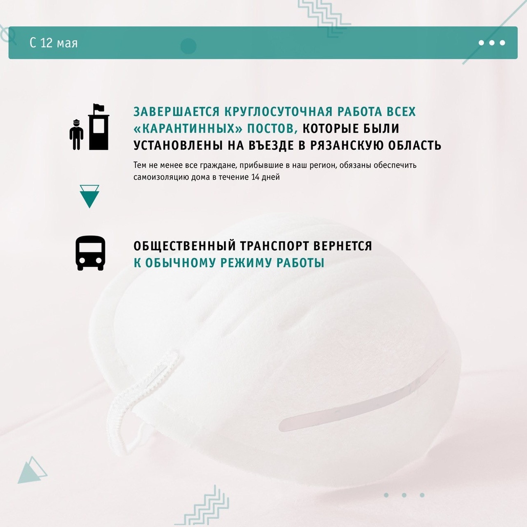 Во-первых, с 12 мая завершается круглосуточная работа всех «карантинных» постов, которые были установлены на въезде в Рязанскую область. Тем не менее, все граждане, прибывшие в наш регион, обязаны будут обеспечить самоизоляцию на дому в течение 14 дней, как это было установлено ранее.