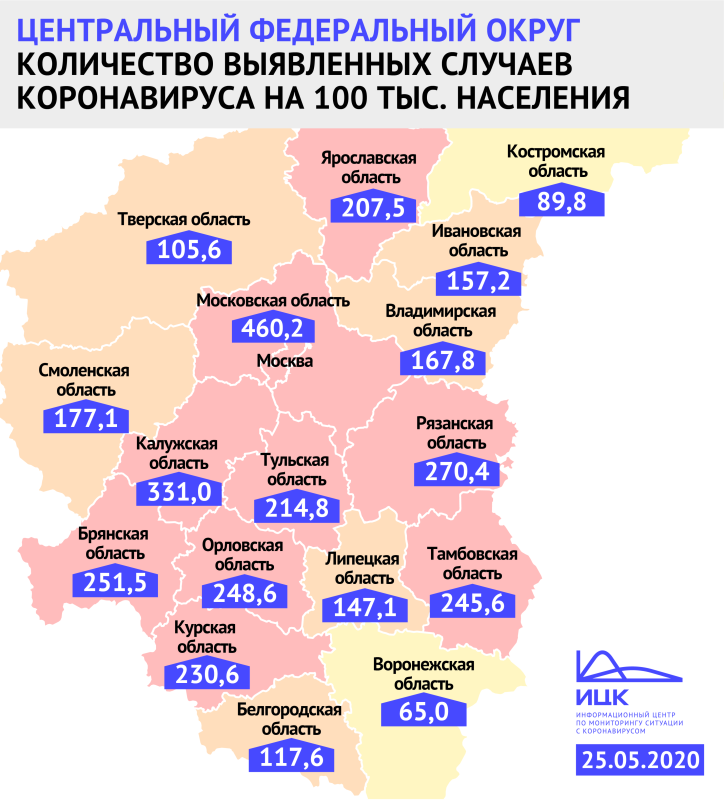 В ЦФО, за исключением Москвы и Московской области, самая высокая заболеваемость в Калужской области - 331 заражений на 100 тысяч населений. Самая маленькая в Воронежской области - 65 зараженных на 100 тысяч населения.