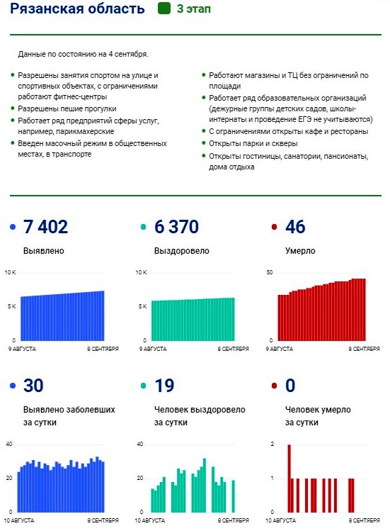 По информации оперативной рабочей группы правительства Рязанской области, 7 сентября в регионе выявлено еще 30 случаев заражения коронавирусной инфекцией.