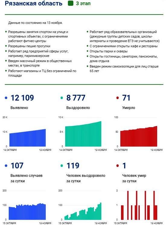 По информации оперативной рабочей группы правительства Рязанской области, 13 ноября в регионе выявлено еще 107 случаев заражения коронавирусной инфекцией, что соответствует 9,52 на 100 тыс. населения (по РФ – 14,97 на 100 тыс. населения). Темп прироста за сутки – 0,9%.