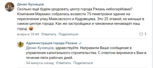 Обращение рязанца по этому поводу пообещали переправить в управление капитального строительства Рязани и ответить в течение пяти дней.