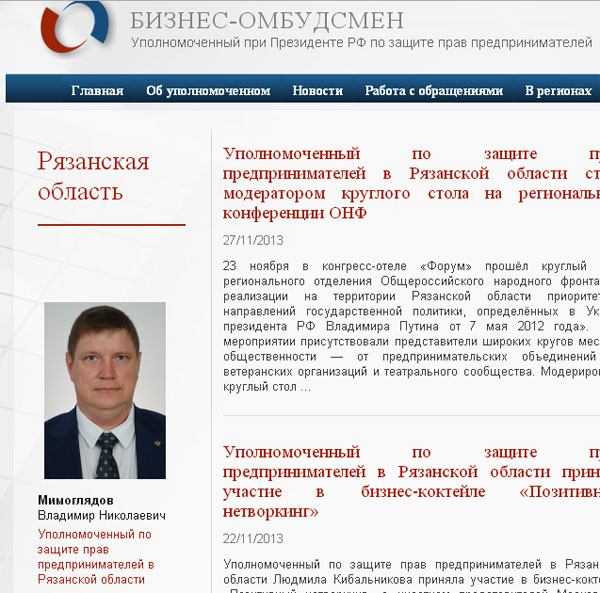 В Рязанской области со второй попытки также не могут организовать прозрачный процесс выбора бизнес-омбудсмена. Последняя новость была в начале апреля: губернатору Рязанской области была рекомендована кандидатура министра экономического развития и торговли Виталия Ларина.